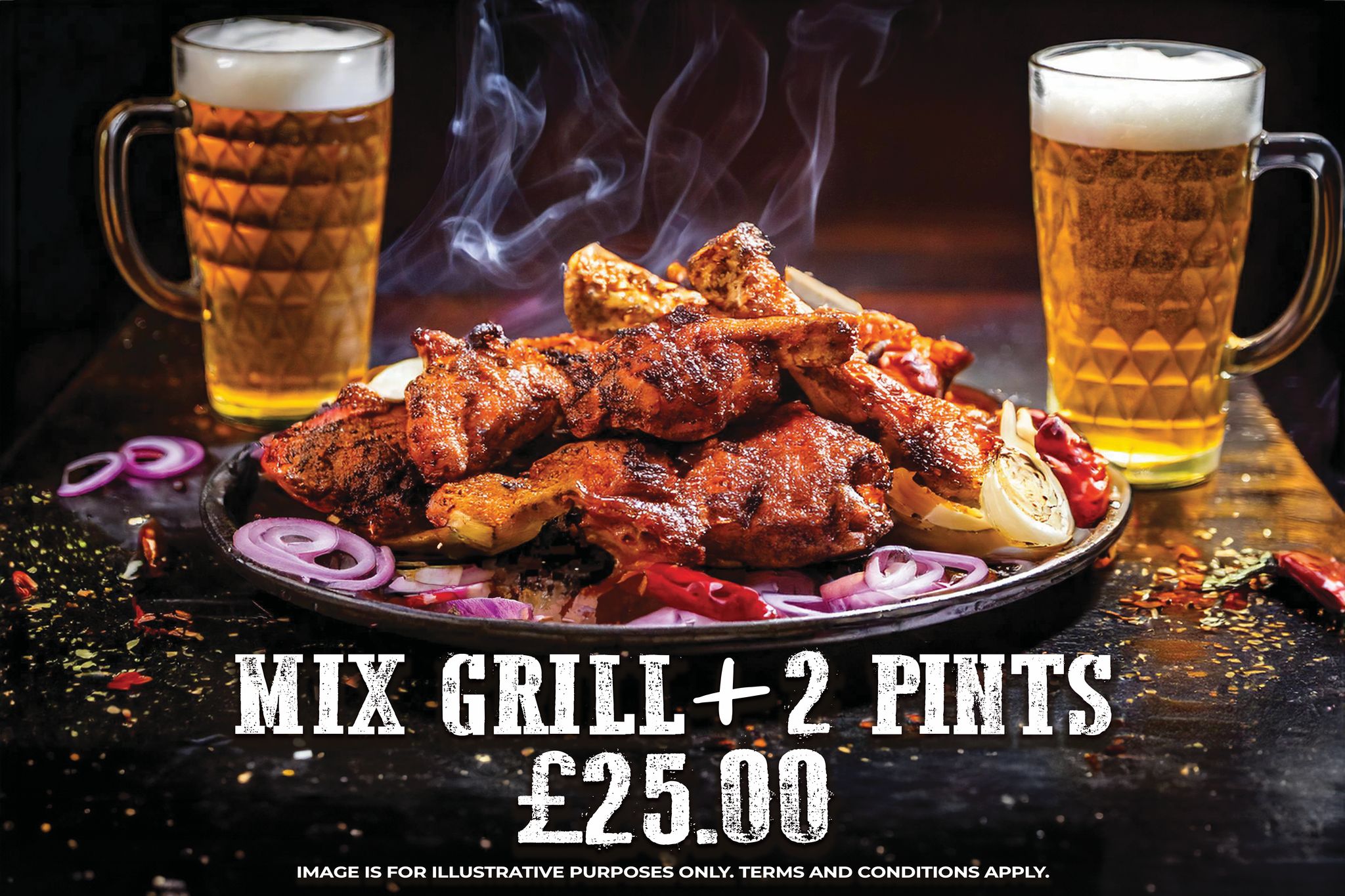 Savour our delicious menu featuring an eclectic array of dishes from around the globe, including classic grilled burgers, naan rolls and moreish traditional Indian curries. Don't miss our ever popular Tandoori Mix Grill Deal, which includes a generous mix grill and two pints for just £25.00!
