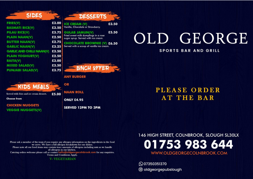 Old George Colnbrook is a traditional cosy pub in the heart of the Heathrow airport villages. Enjoy our lovely open garden patio and classic hearty Punjabi pub grub.