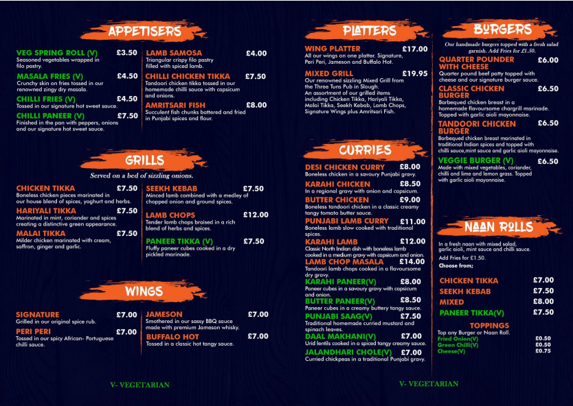 Indulge in mouth watering North Indian food, pub classics, appetisers, snacks, and refreshing drinks at Old George Colnbrook. Our menu offers a perfect pairing of delicious food and a wide selection of beverages to enjoy.